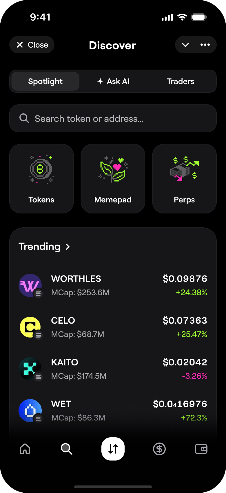 I built Lite and Degen on shared patterns and components — making the transition between modes seamless. A user who starts in Lite and grows comfortable can move to Degen without feeling like they've switched products. Each user chooses a mode based on their experience and trading style — while staying within the same ecosystem.